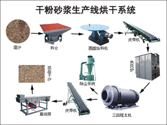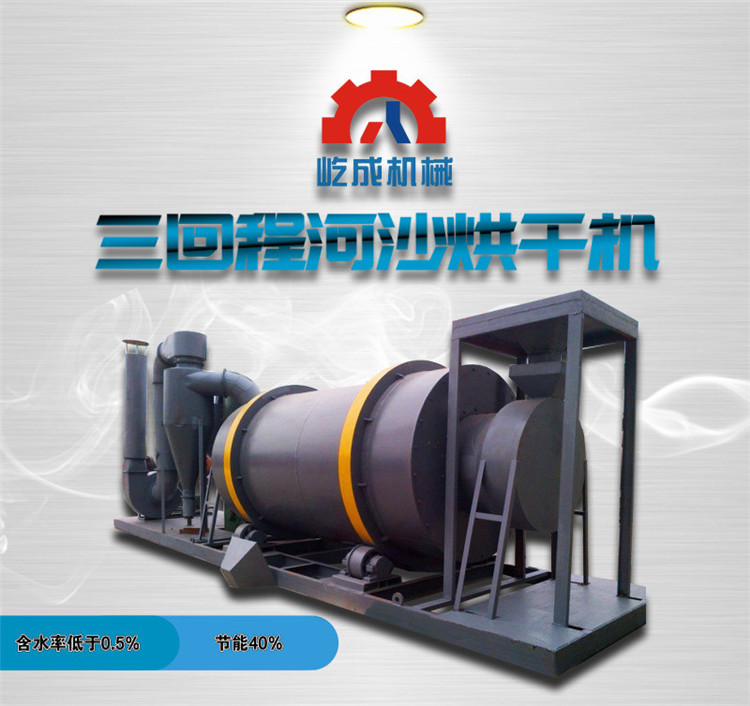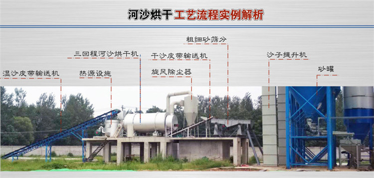 河沙通過(guò)皮帶輸送機(jī)到達(dá)料斗進(jìn)入到 加料管(流沙管),依靠加料管的傾斜度,物料進(jìn)入到三回程河沙烘干機(jī)的內(nèi)部,載熱體從低端進(jìn)入后,與河沙形成逆流接觸,在筒體內(nèi)部對(duì)物料進(jìn)行加熱,在圓筒的轉(zhuǎn)動(dòng)之下,河沙經(jīng)過(guò)三個(gè)來(lái)回的流動(dòng)烘干,終在自身的重力作用下,到達(dá)出料口經(jīng)過(guò)接料斗排除,之后物料通過(guò)皮帶輸送機(jī)進(jìn)入到振動(dòng)篩進(jìn)行篩分,成品沙的生產(chǎn)算是完成了。