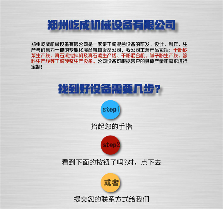 鄭州屹成機(jī)械設(shè)備有限公司是一家集干粉混合設(shè)備的研發(fā)、設(shè)計(jì)、制作、生產(chǎn)與銷(xiāo)售為一體的專(zhuān)業(yè)化混合機(jī)械設(shè)備公司,我公司主營(yíng)產(chǎn)品包括:干粉砂漿生產(chǎn)線(xiàn)、真石漆攪拌機(jī)及真石漆生產(chǎn)線(xiàn)、干粉混合機(jī)、膩?zhàn)臃凵a(chǎn)線(xiàn)、涂料生產(chǎn)線(xiàn)等干粉砂漿生產(chǎn)設(shè)備。公司設(shè)備可根據(jù)客戶(hù)的具體產(chǎn)量和需求進(jìn)行定制!公司地址:河南省滎陽(yáng)市s232省道與科學(xué)大道交匯處向南1公里路東。聯(lián)系電話(huà)0371-64928777,微信15617783000,QQ1610666498,企業(yè)網(wǎng)站m.yiliwei.com期待您的來(lái)電咨詢(xún)。